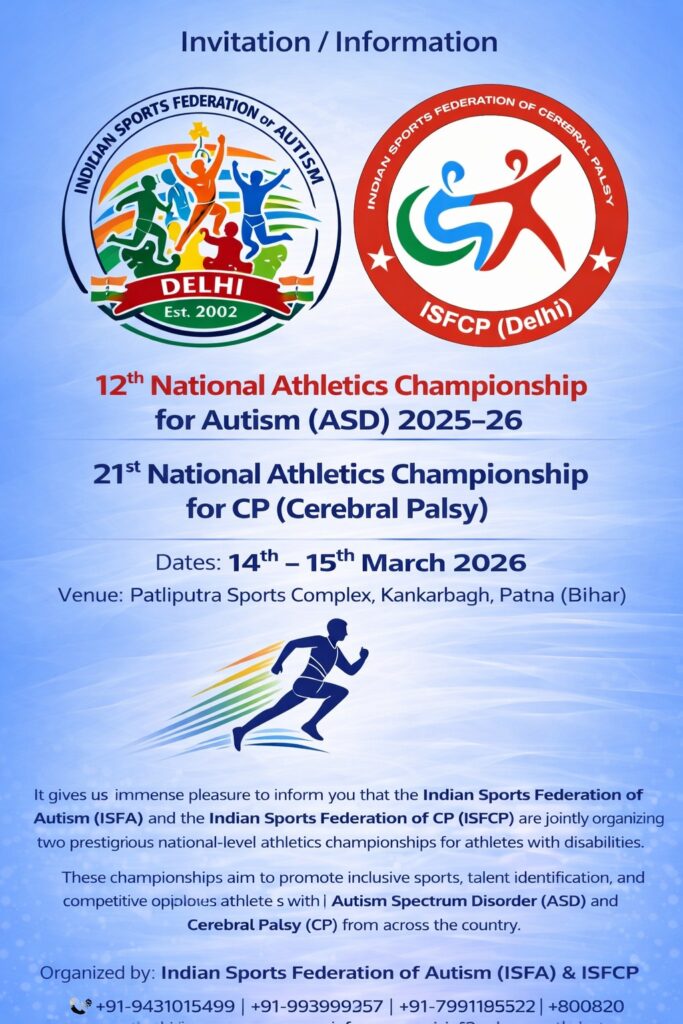 🏃‍♂️ राष्ट्रीय एथलेटिक्स चैंपियनशिप 2025–26: ऑटिज़्म (ASD) एवं सेरेब्रल पाल्सी (CP) खिलाड़ियों के लिए सुनहरा अवसर