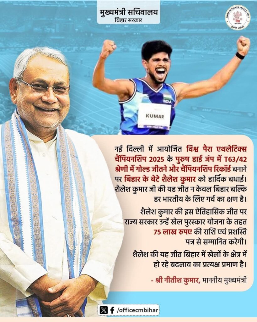 Heartfelt thanks to Hon’ble CM Shri Nitish Kumar Ji for announcing ₹75 lakh cash award to our Golden Boy Shri